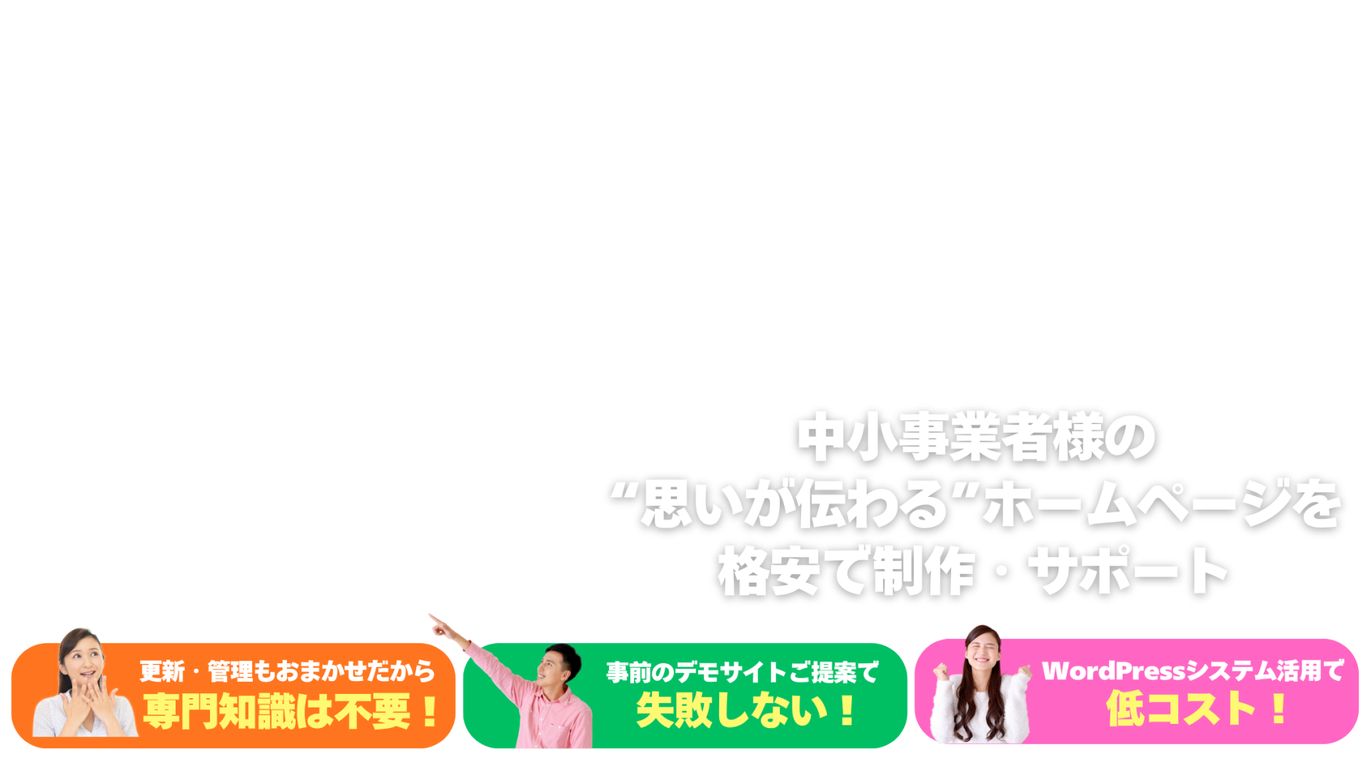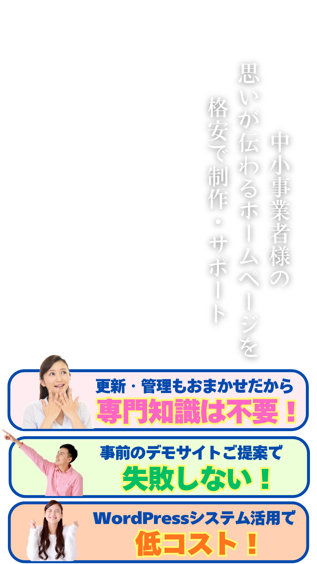世界のサイト制作でトップシェアを誇るWordPressシステムを使うからです。日々便利に進化するWordPressを使うことでスピーディー&低コストなホームページ制作を実現します。